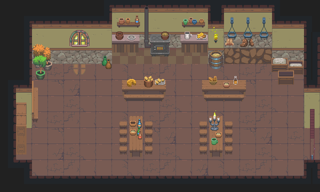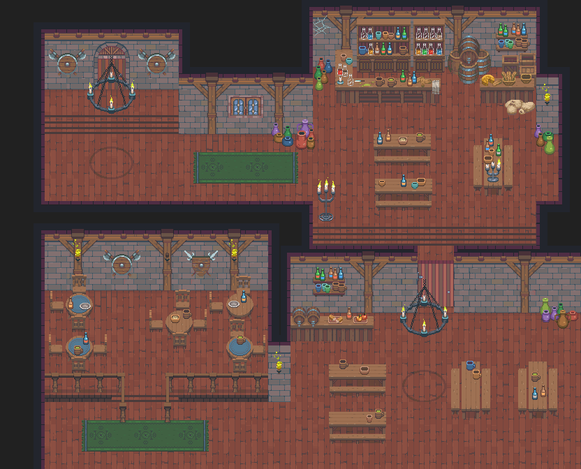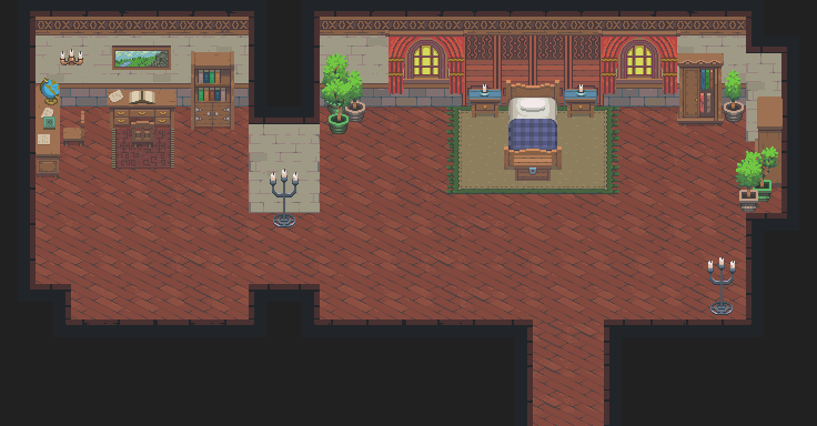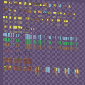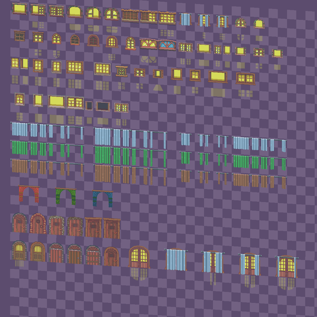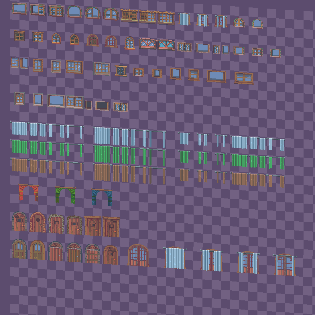 ✅ The available tilesets/doors/windows use walls from Village pack in order to be coherent (sometimes with a subtle color change)